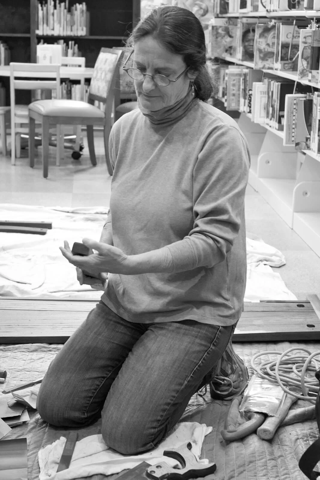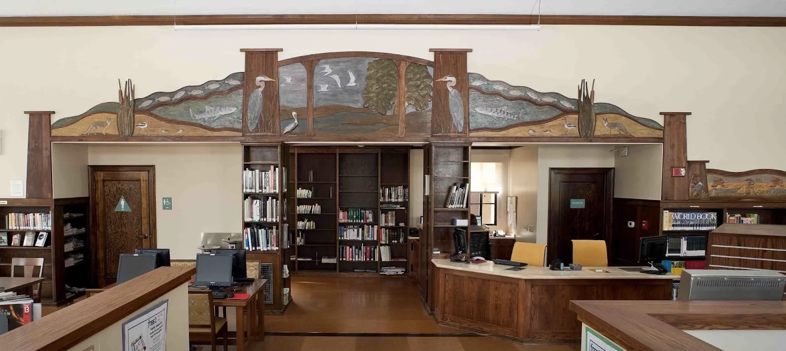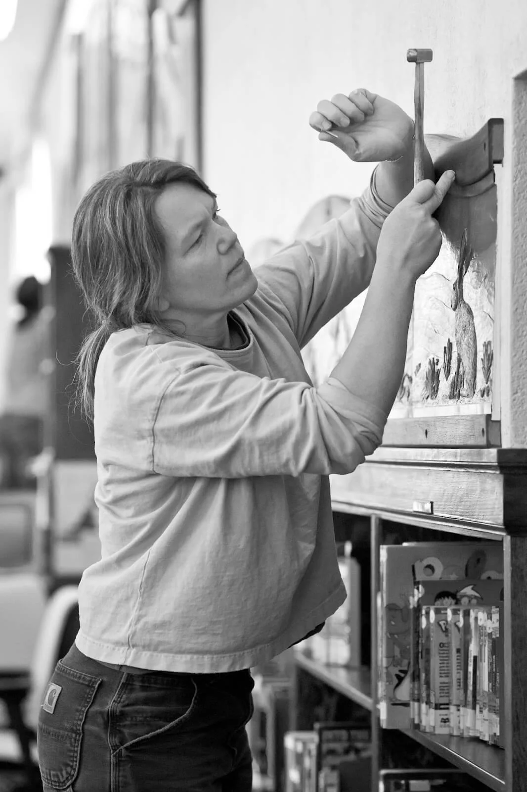 In competition with over 100 artists, Debey and Terry were chosen to create artwork for the Alameda West End Library, a PWA building built in 1935. The wall above the circulation desk is the site for the carved frieze, 4’ x 28’. The Library Art Committee asked for a work that would be inclusive of and draw in all the residents of the city of Alameda, especially the very young and older adults.