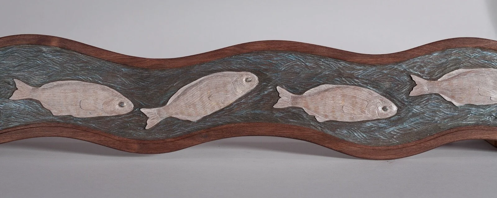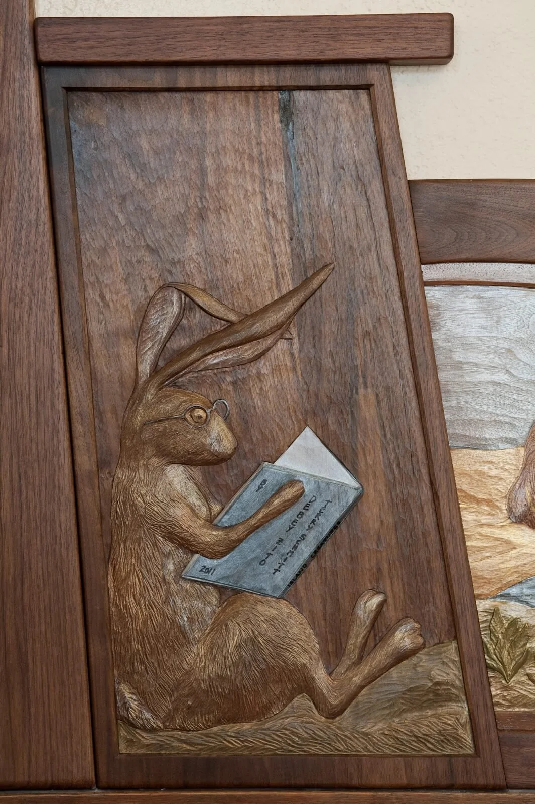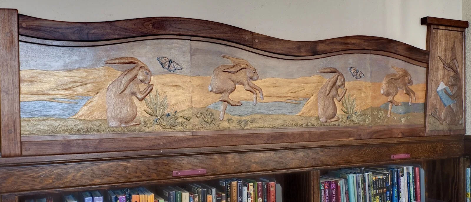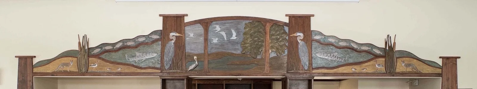Debey chose to design a frieze of Terry’s carvings devoted to the wildlife of Alameda Island. With over 20 miles of shoreline, the citizens of Alameda are never far from the creatures they share their island with. The artwork is “framed” with an arch, tapered posts and waves. Leopard sharks and surf fish swim in the bay, crab and shorebirds on the sand, hills and water and least terns fly under the bridge. In the 21’ long children’s frieze area, four be-speckled hares are relaxing and reading books. The hares frame a trail of leaping bunnies.